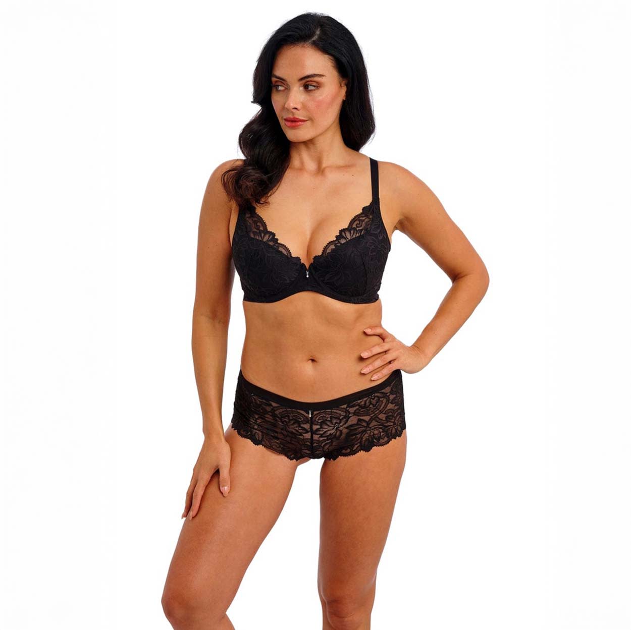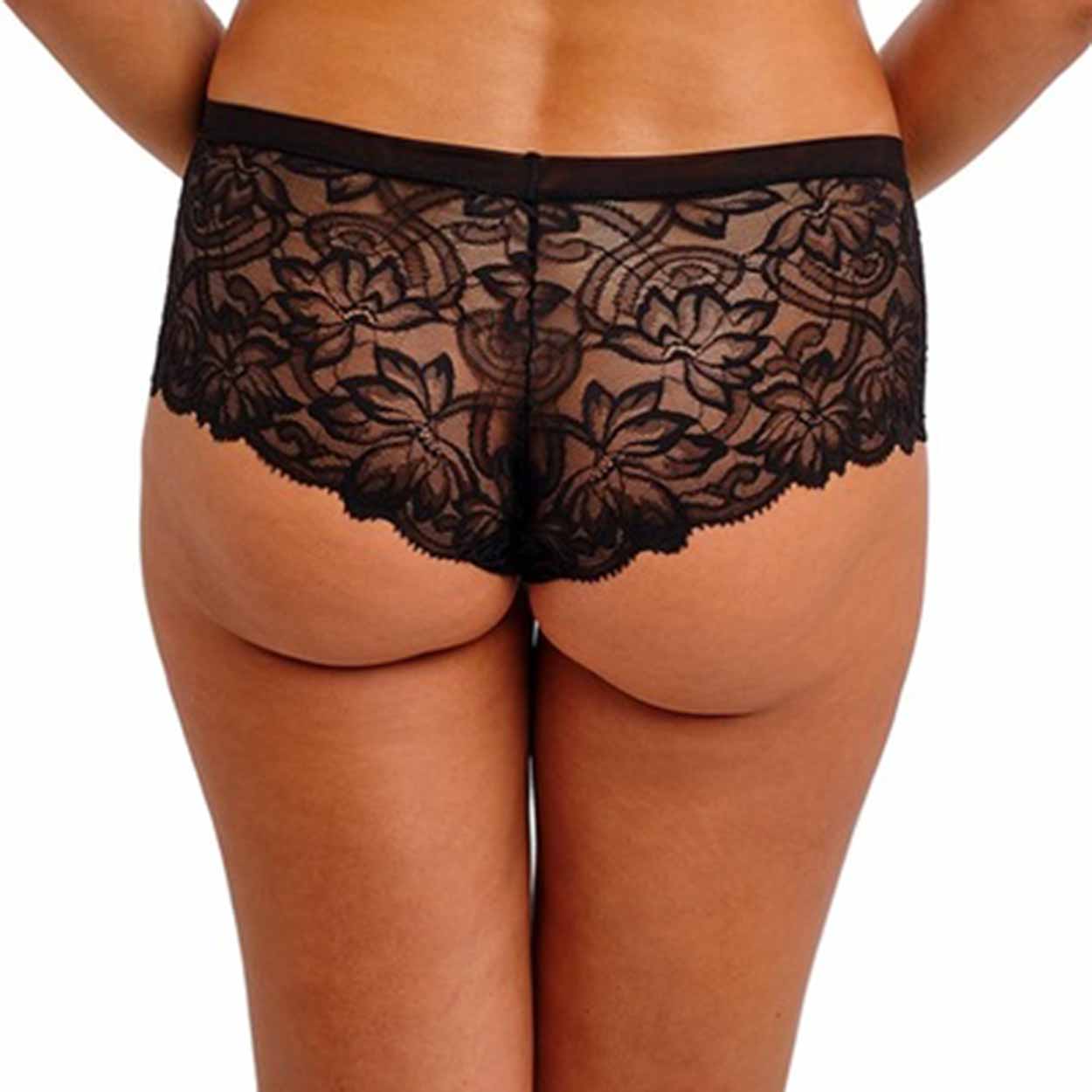 The Abellia Short is a comfortable and cheeky style with a mid-rise waist and cheeky back coverage. It's a full stretch lace short with beautiful scallop detail at the leg edges. A folded stretch mesh waistband ensures comfort, and a delicate pearl drop effect trim at the center front adds a final elegant touch.
