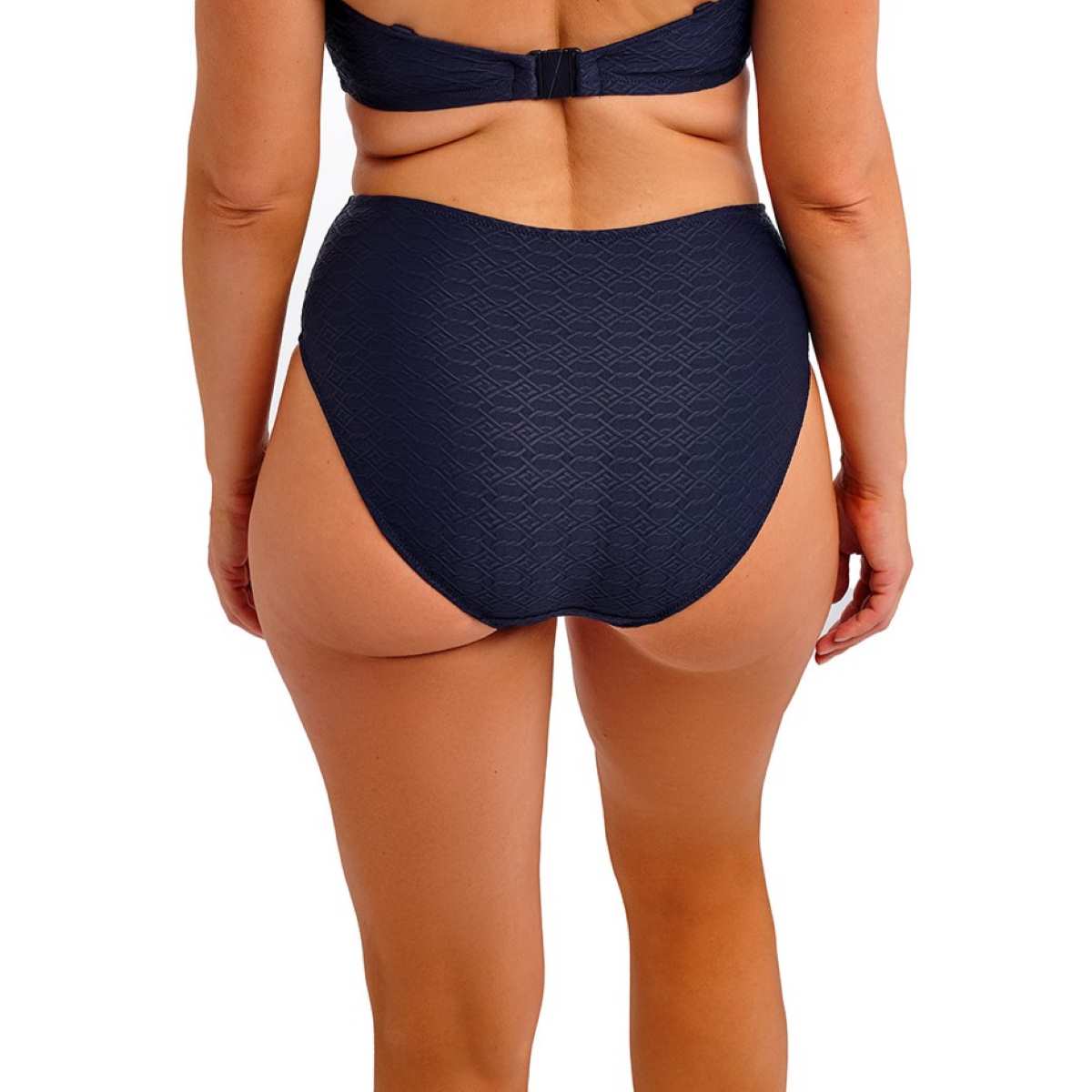 Flattering high-rise coverage with a higher-cut leg for a sleek silhouette. Fully lined for comfort and support, finished with a gold-coloured chain trim at the centre front for a chic belt effect.