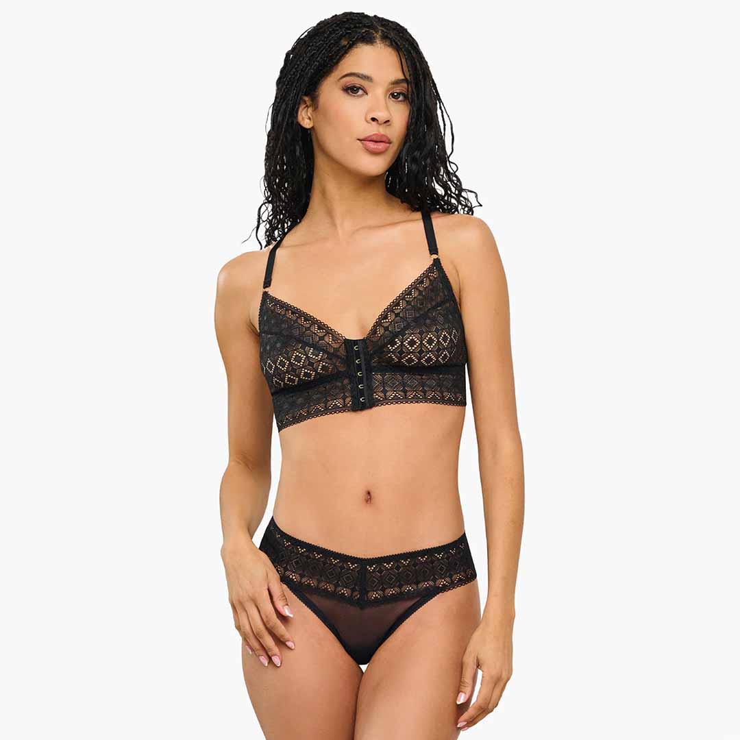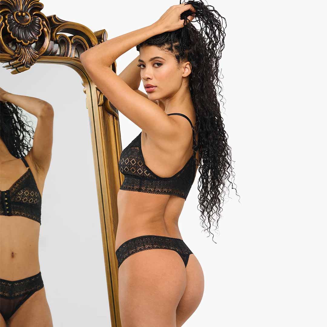 This Basilica mid-rise lace thong features a wide, soft lace waistband for a smooth, dig-free fit. With minimal rear coverage and a breathable cotton-lined interior, it offers both comfort and elegance.