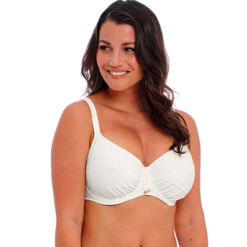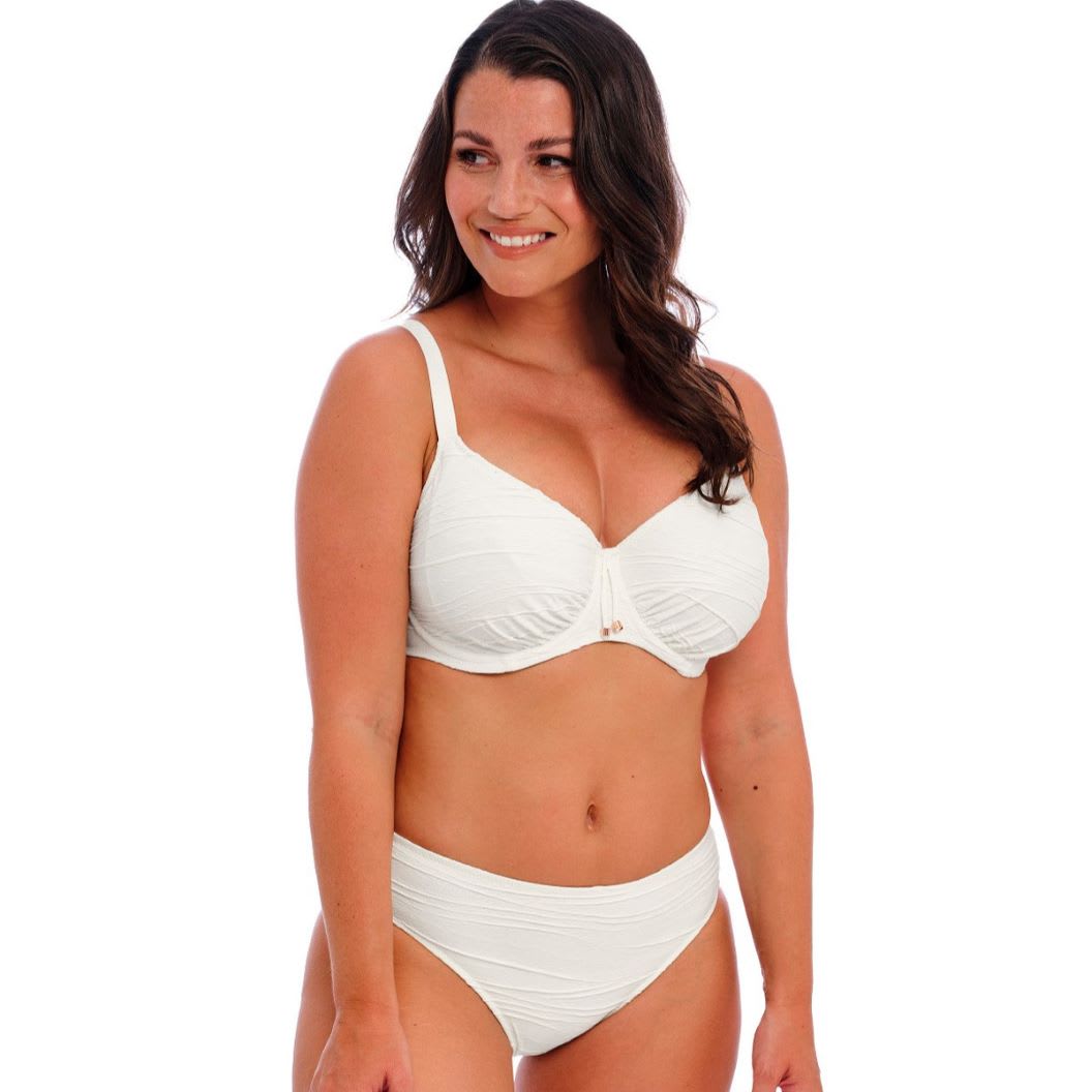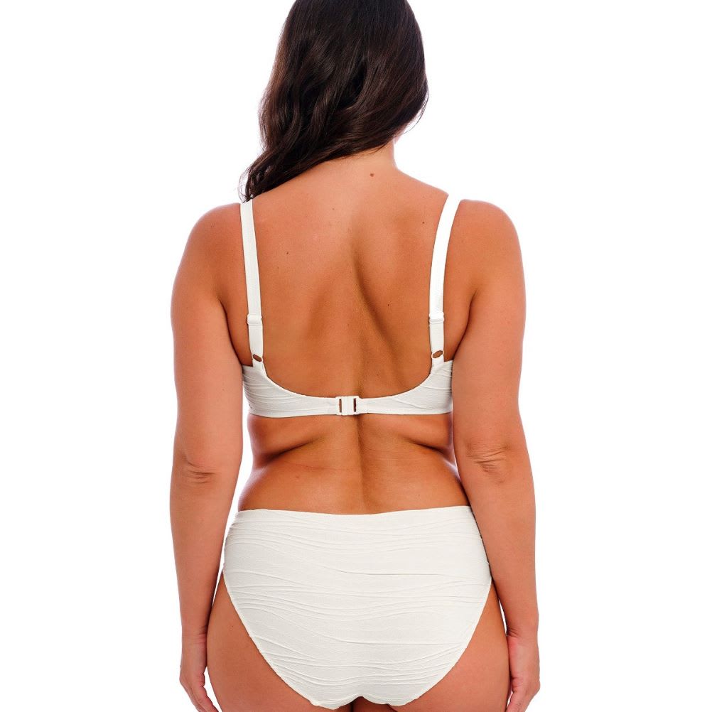 The Beach Waves Gathered Full Cup Bikini Top is crafted from a buttery soft fabric that creates a beautiful ripple effect resembling the soft ocean waves. Featuring gathered cups that flatter all bust shapes, fuller coverage with concealed side slings for forward projection, and power-net lined wings for support and anchorage.