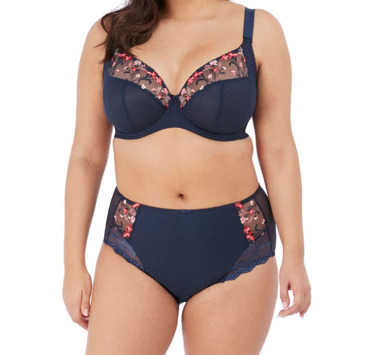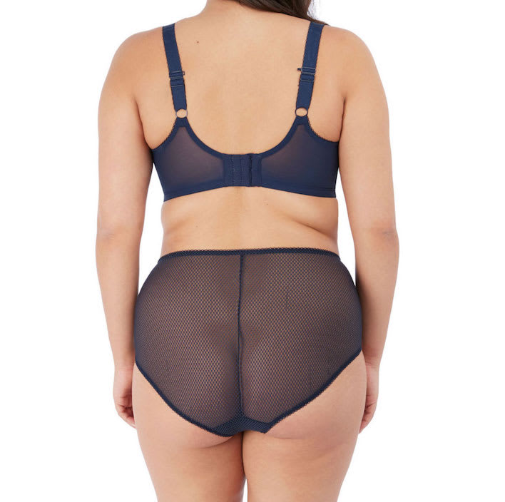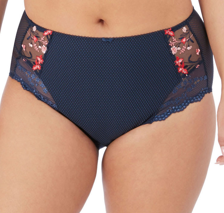 CLEARANCE - Non-returnable. The Elomi Charley Full Brief has a comfortable high rise fit, sheer lace rear, and sexy fishnet overlay at front. Made of nylon, polyester and elastane.Sewn-on elastic waistband with picot lace trim along top. Bow sewn on at center front waist.Opaque front has a fishnet overlay.Sewn-on elastic with picot lace trim along front of leg openings.High rise.Moderate rear coverage.Sheer, scalloped lace rear with floral designs.Keyhole centered at top of rear.Center back seam for a defined fit.Sewn-in cotton crotch for comfort.