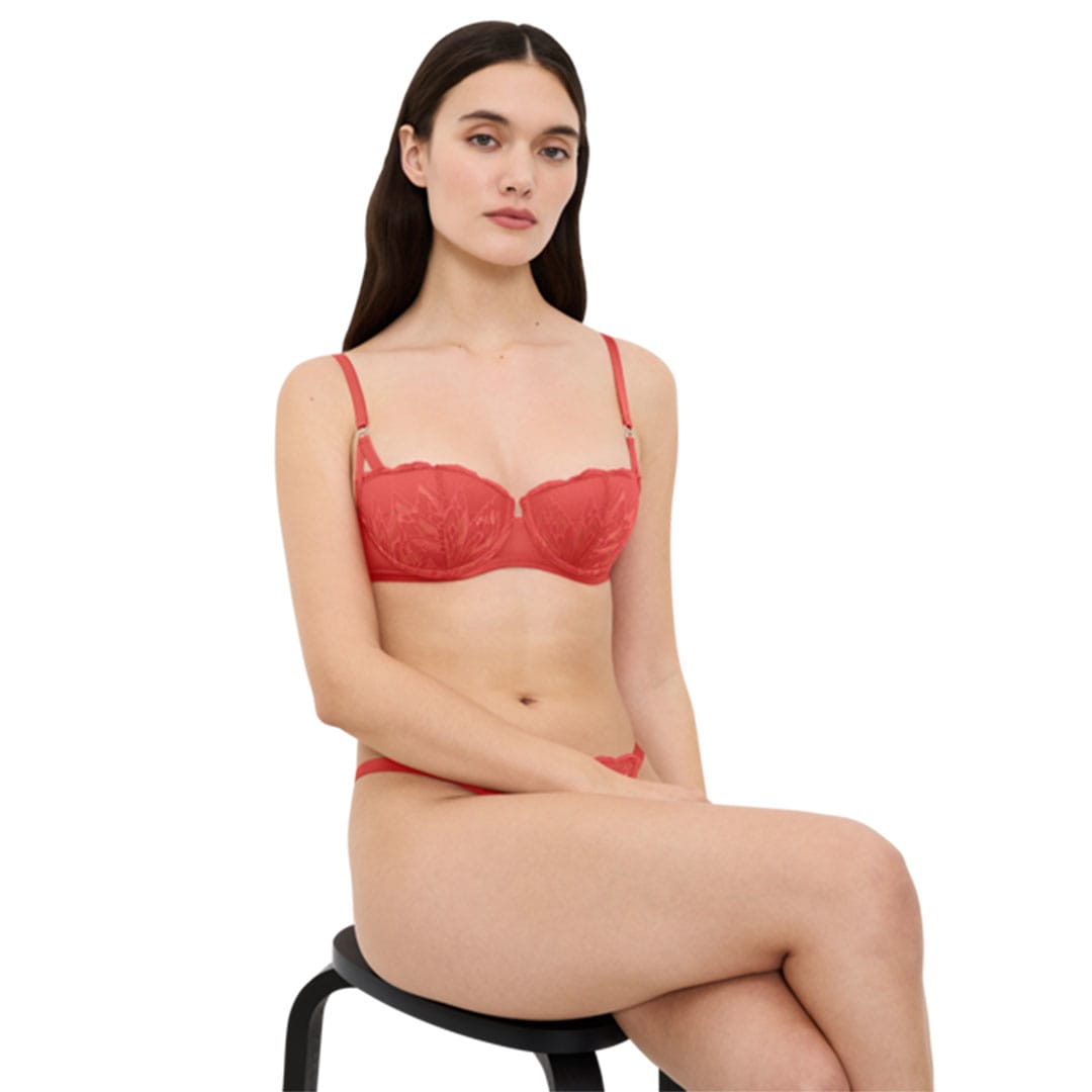 The Crazy Stupid Love Half Cup Bra features flexible comfort wires, feather-soft cups, elegant double-ring straps, and fancy dotted mesh wings for a lightweight yet striking look.