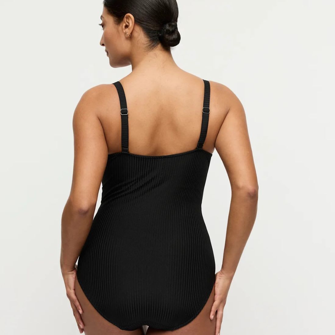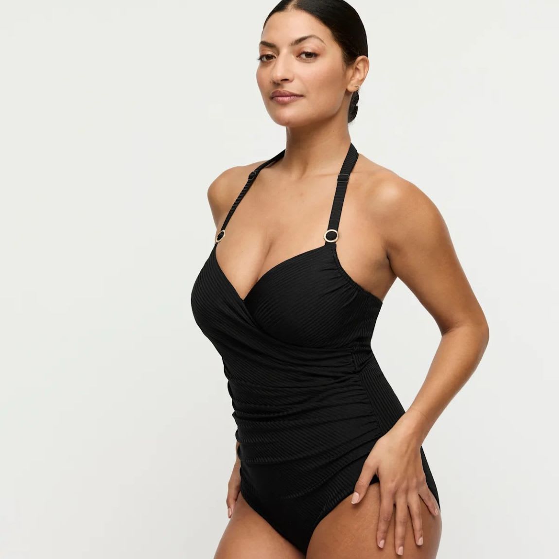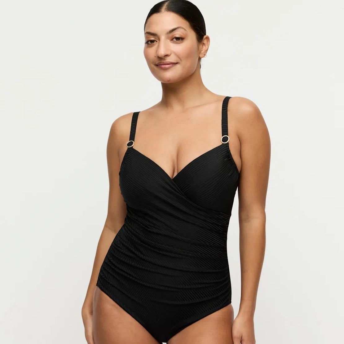 Trendy ribbed look with sun-catching details. Comfy control swimsuit featuring full cups for added support.