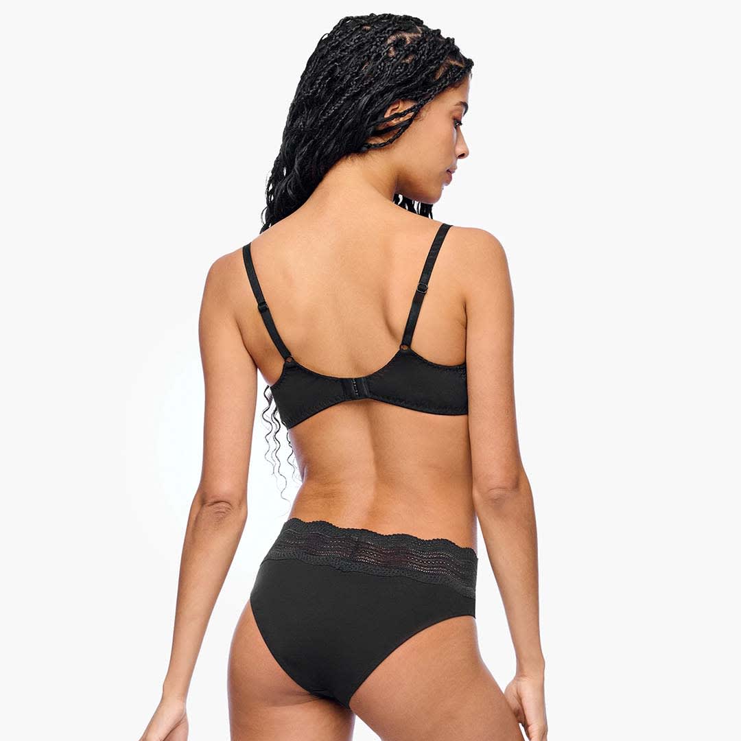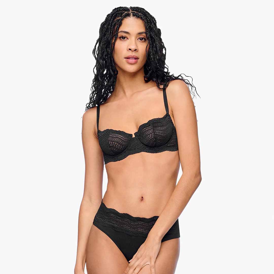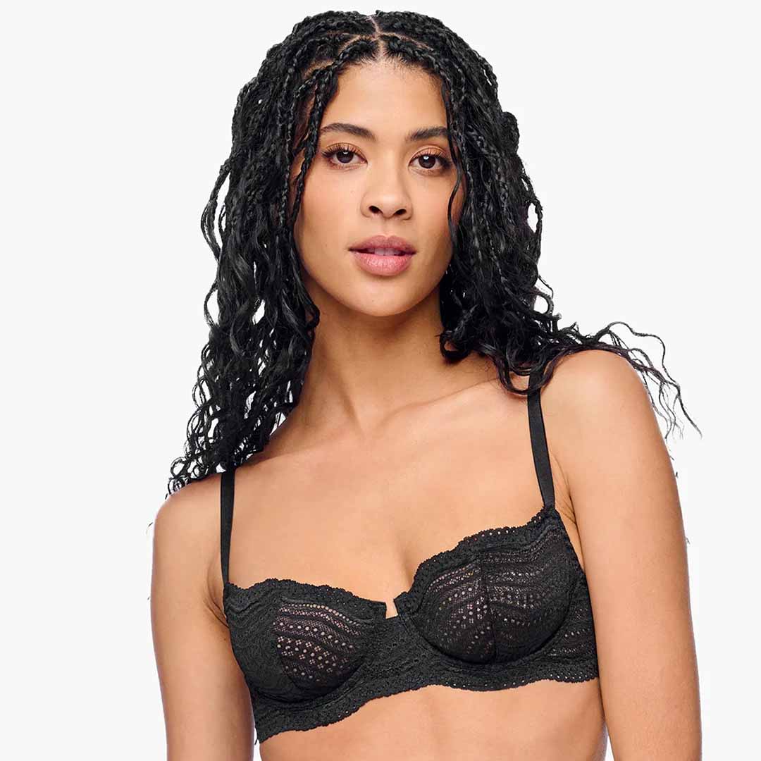 A supportive cotton underwire bra designed for everyday elegance. Features flat lace that sits smoothly under clothing for a sleek, polished look, with invisible tulle lining for added support and lift. The Dolce Balconette Bra is available in sizes up to a G cup for optimal coverage. Finished with a hook-and-eye back closure and adjustable straps. Hand wash in cold water; do not tumble dry.
