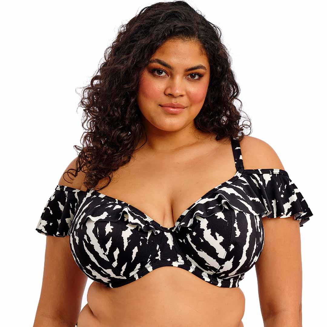 This underwired plunge bikini top features slim straps and a versatile ruffle that can be worn on or off the shoulders. Echo Shell Underwire Plunge Bikini Top is fully lined with a light yet supportive fabric, giving you the look of a bikini with the dependable fit of an Elomi lingerie bra. The cups, ruffle, and back are crafted from a lightweight printed fabric with LYCRA® XTRA LIFE™ for enhanced durability, while the powernet-lined back offers added support. Adjustable shoulder straps allow for a customised fit.