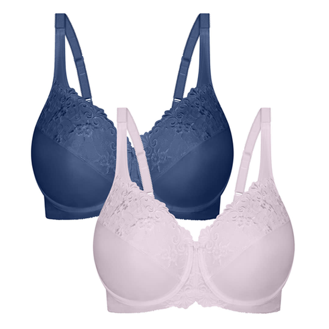 The popular Embroidered Minimiser Bra comes in a great-value 2-pack featuring complementary colours. Designed to reduce the bust appearance by up to one cup size, it offers firm support, elegant embroidery, and wide straps for all-day comfort and a smooth look under clothing.