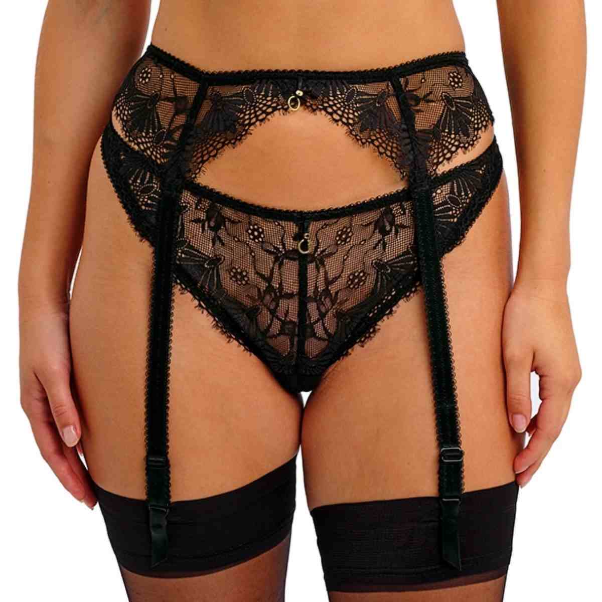 The Fascinate suspender features beautiful eyelash edge lace across the full front, a secure hook and eye fastening, adjustable suspender straps, and a charming metallic ring and ribbon detail at the center front.