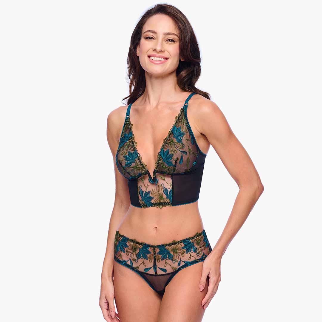 This longline bralette features non-padded cups with a flattering V-wire plunge for a modern, feminine silhouette. Crafted from custom French embroidery and soft stretch mesh, it offers both comfort and elegance. Adjustable straps ensure a flexible fit. Hand wash only and avoid machine drying to preserve its