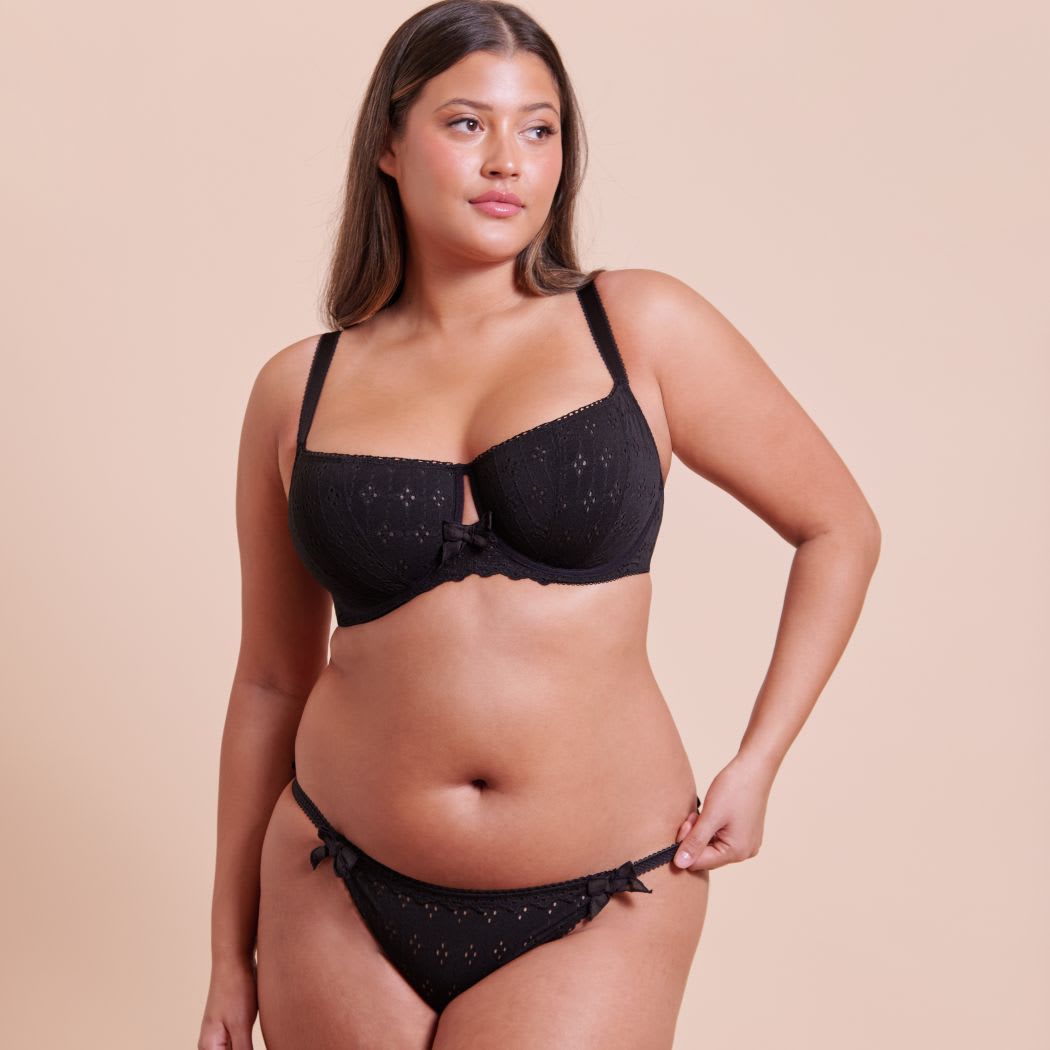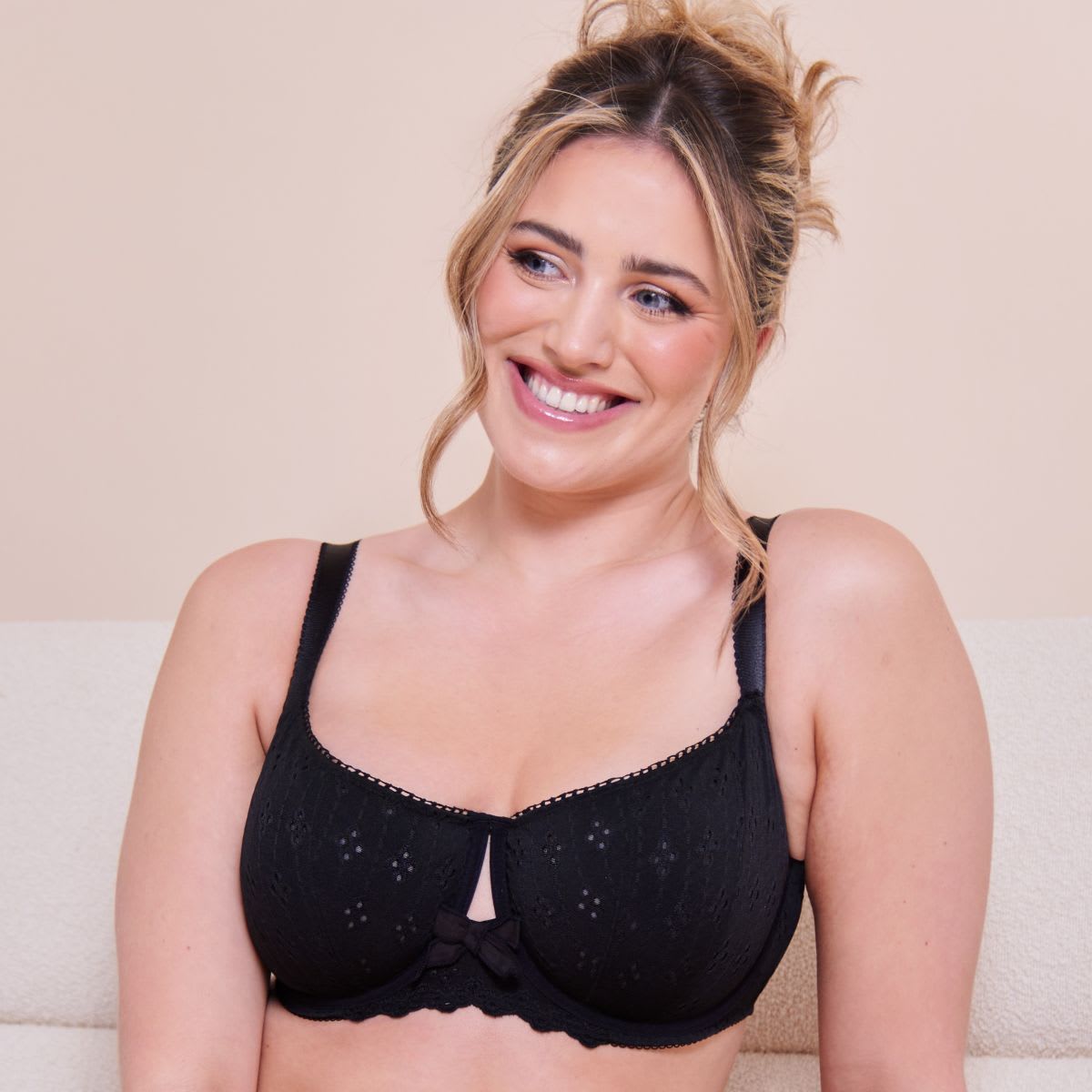 Delicate floral broderie anglaise-look material with matching trim, making this a super feminine and on-trend set. The vertical cup seam offers rounded cup shape all trimmed with pretty edging and girly bows. Non-padded underwired balcony bra shape.