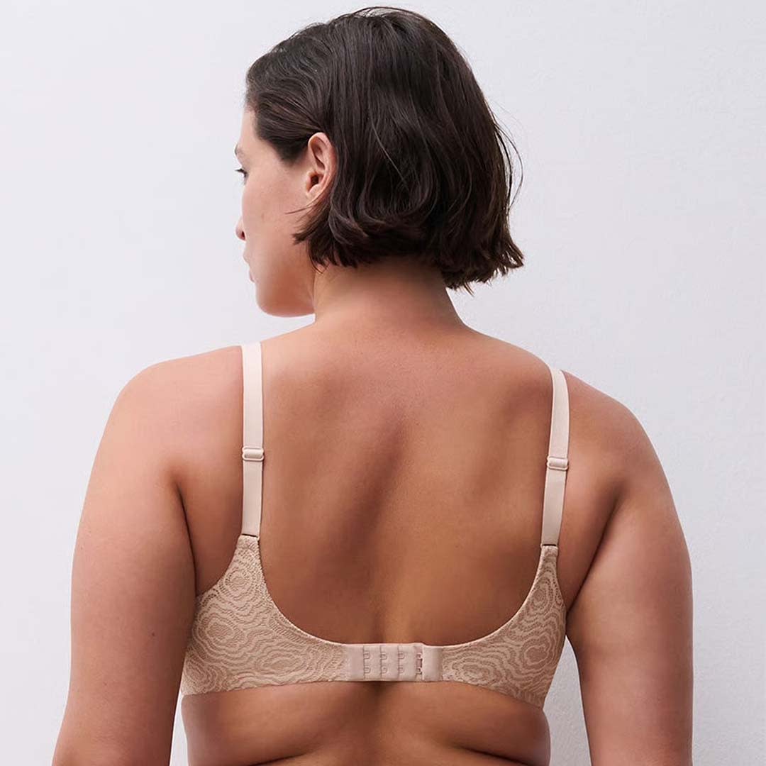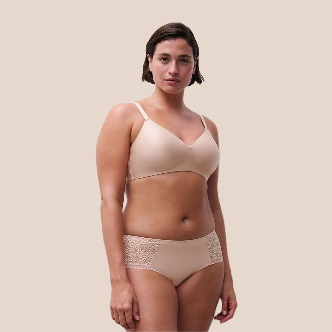 The Jolie Wirefree T-Shirt Bra with contour cups for a naturally rounded shape, flexible side support, a lined lace back for added stability, adjustable straps, and a delicate jewel detail at the centerfront.