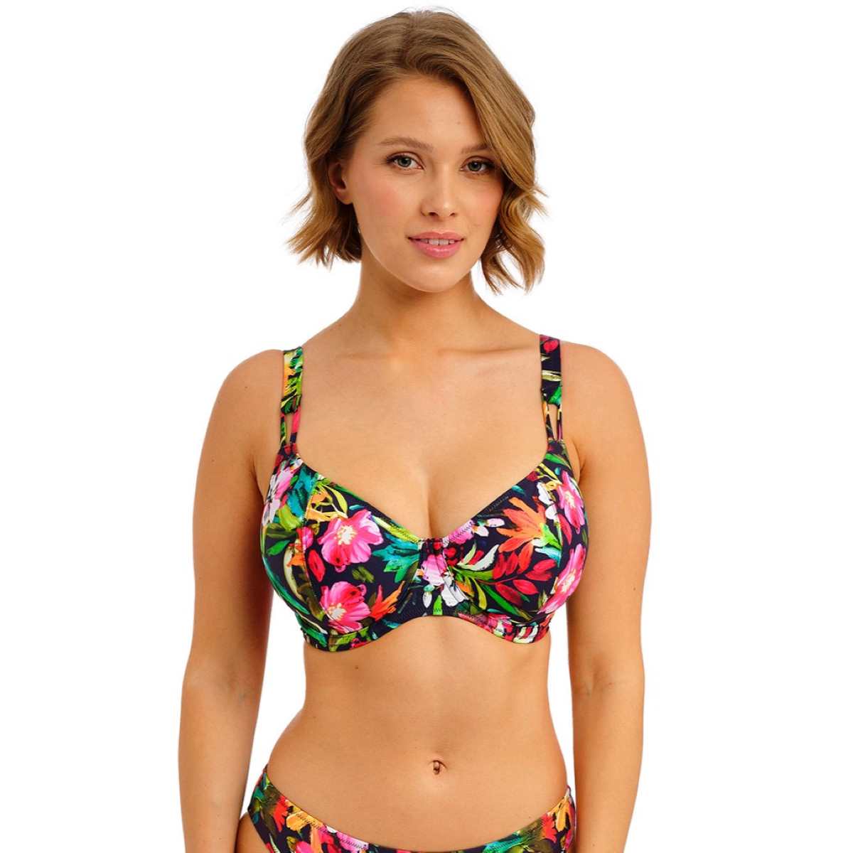 Hit the waves in style with Kailua Shores, a bold tropical print designed to make a statement. Featuring hot pinks, fiery oranges, and lush jades against a deep navy base, with select styles finished with gold-coloured leaf trims, this collection is perfect for poolside lounging or beach days. The reduced-coverage Underwire Plunge Bikini Top is ideal for tanning, with a low plunging neckline, underwired lined cups for shape and support, and fully adjustable straps with a J-hook for easy racer-back conversion, finished with decorative front loops at the apex.