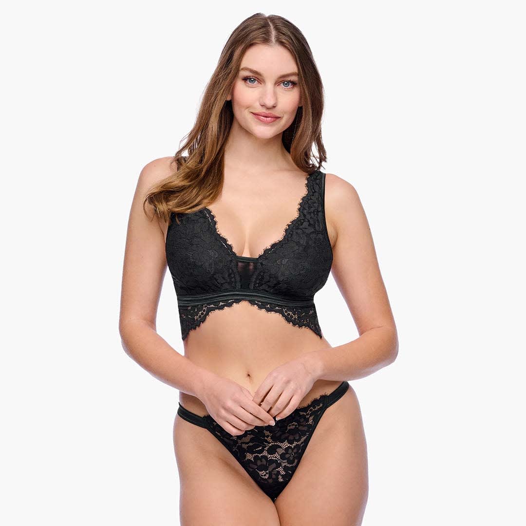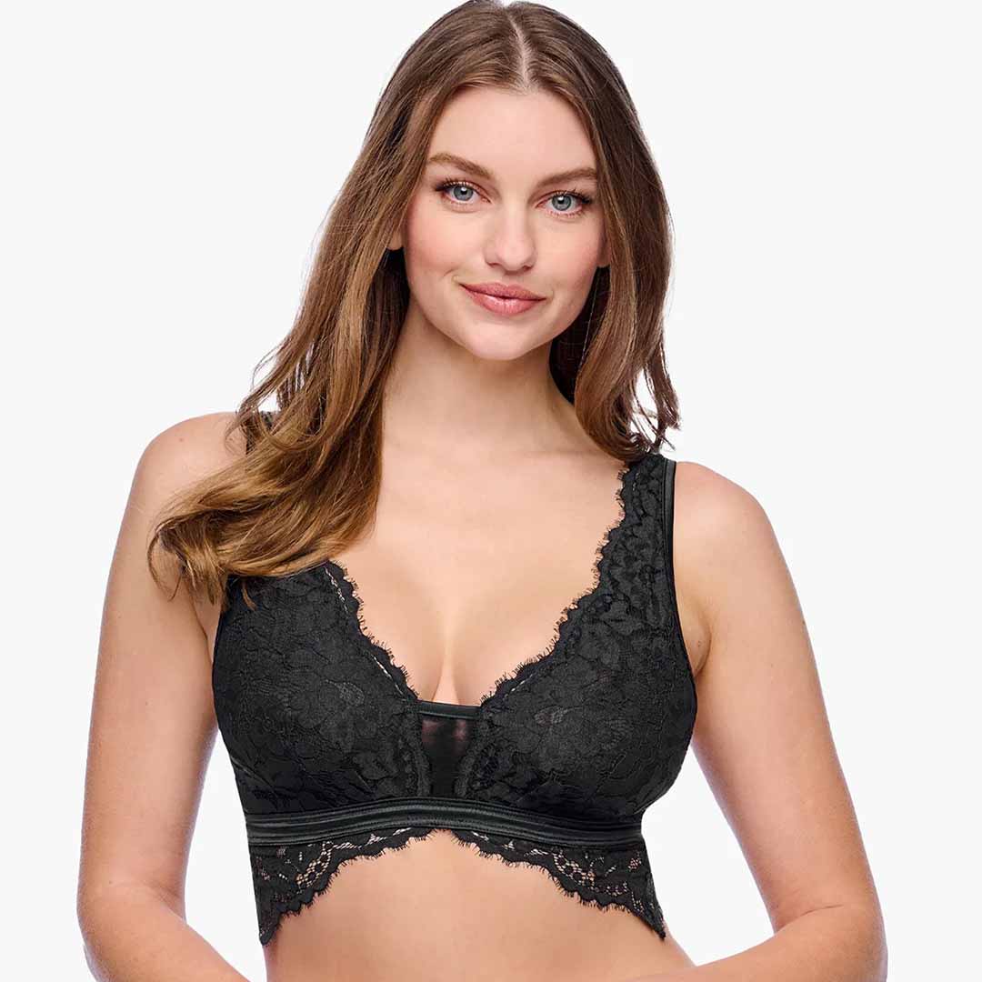 Designed for fuller cups with smaller bands, this Magnolia Curvy Wireless Bralette combines comfort and support with a touch of elegance. Crafted from semi-sheer scalloped lace and finished with a satin band detail, it offers both style and structure. The powermesh lining provides gentle support, while wide adjustable straps and a hook-and-eye back closure ensure a secure, customizable fit. Care: Hand wash only. Do not tumble dry.