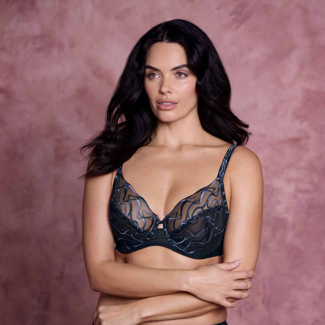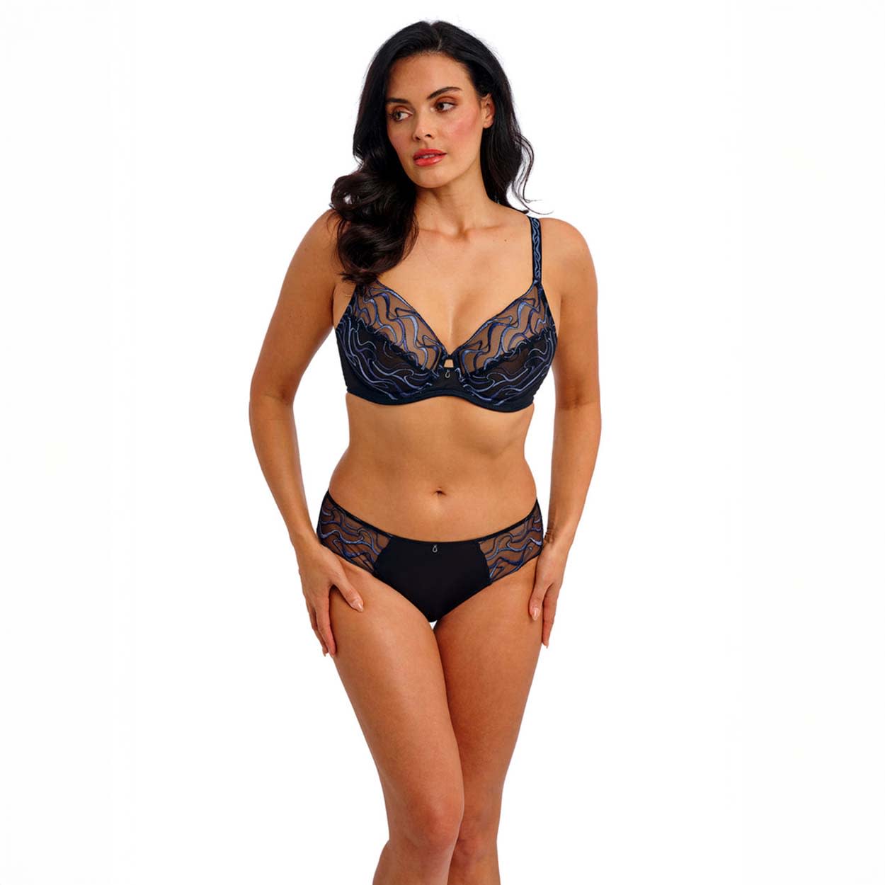 The Mayumi Underwire Bra is designed to give you a natural shape and optimum support. Its three-section average wire cups feature multi-tonal blue geometric embroidery with a sheen finish on a black tulle net base. The scallop edge embroidery at the neckline adds a delicate touch, while the embroidery overlaid onto the sheer tulle bottom cup, with a liner, provides shape and support. A dropped open center front in tulle and a scoop center back ensure straps stay in place. Powernet wings provide comfort and support, and plain plush elastics at the underarm and underband give a tailored finish. This bra also has underwires that vary in strength across sizes for a good level of support, fully adjustable stretch straps with embroidery detail, and a soft-touch hook and eye adjustment. A contemporary charm at the center front completes the look.