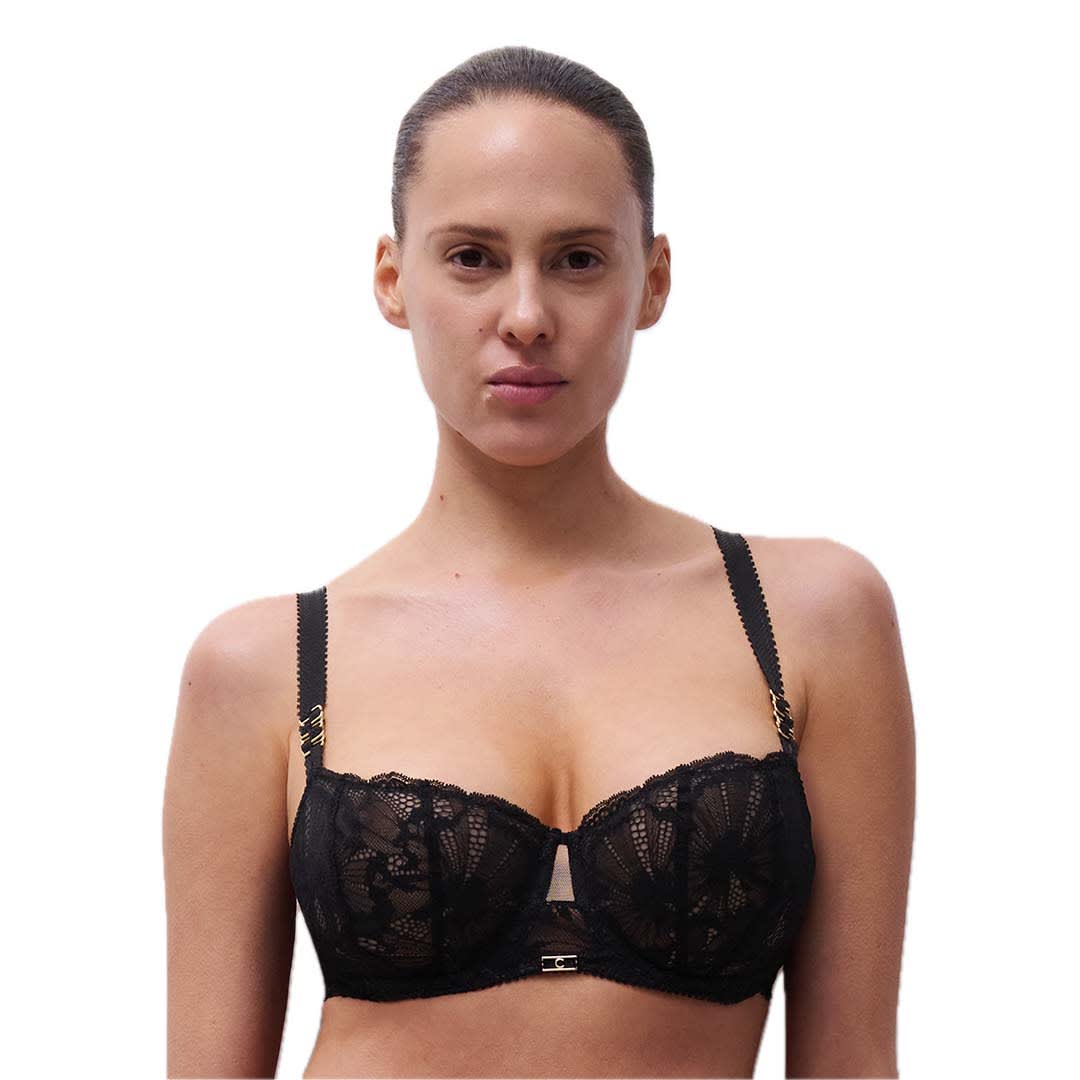 The Muse Half Cup Bra with outer straps that shape a beautifully rounded bust and offer low coverage. Crafted in striking floral lace with semi-transparent front and back, finished with gold strap jewellery and a cut-out centre detail.