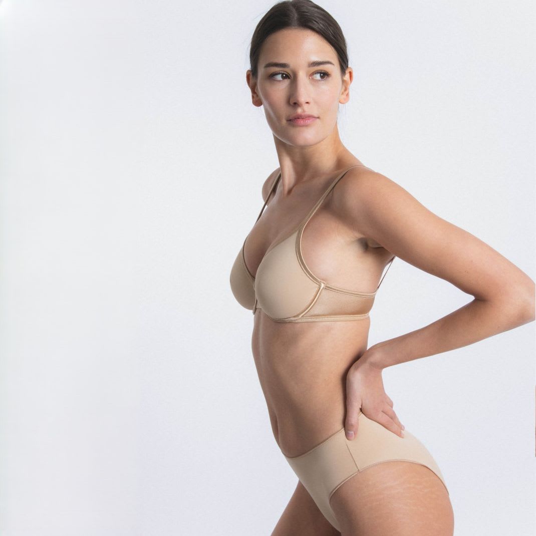 Smooth elastic mesh bra, invisible under clothing. Natural curve. Between the two cups, satin crossed bands. Satin finishes and back.