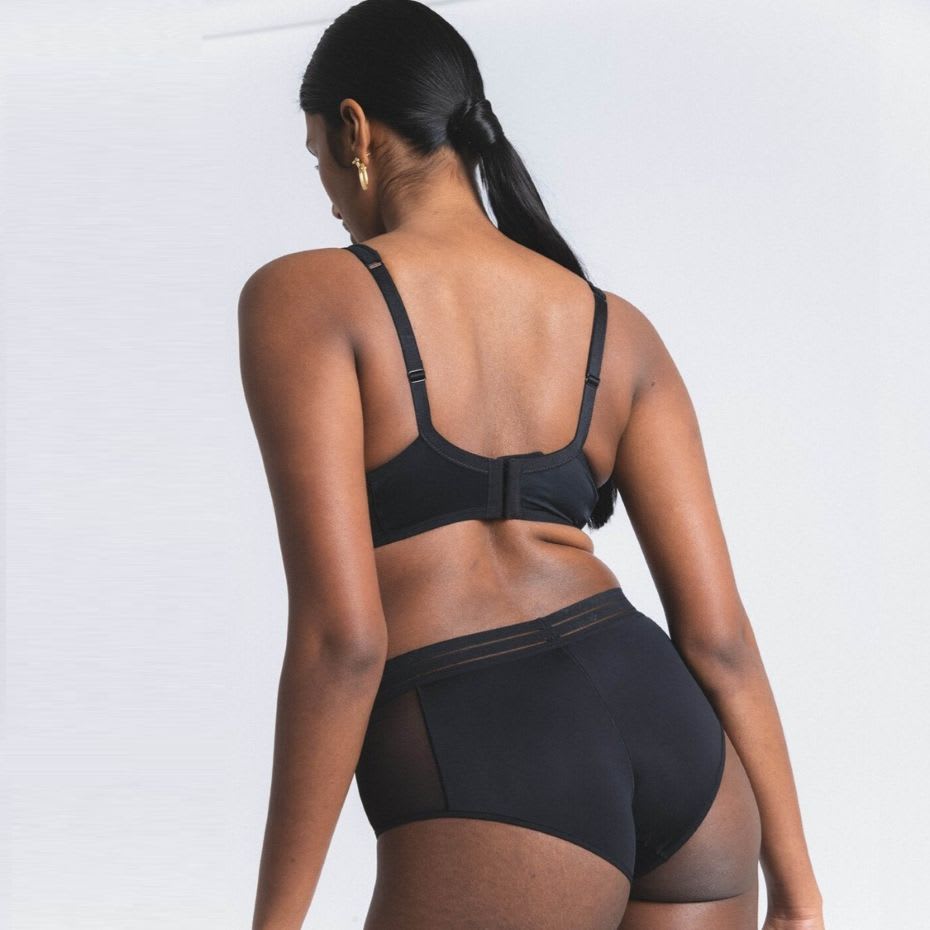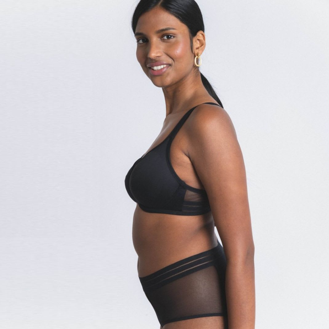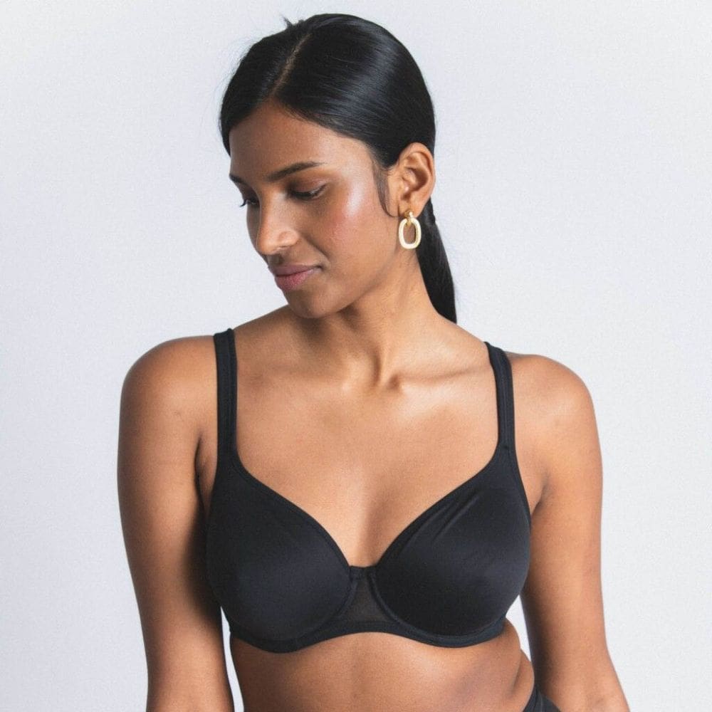 This moulded cup bra is made with opaque knit fabric. It has Voile fabric between cups for lightness and lined for support. The wide shoulder straps with a padded interior construction give extra support. The sides are veil enhanced with an elastic tri-band accompanied with a knit fabric on the back with silicone strips inside for more support.