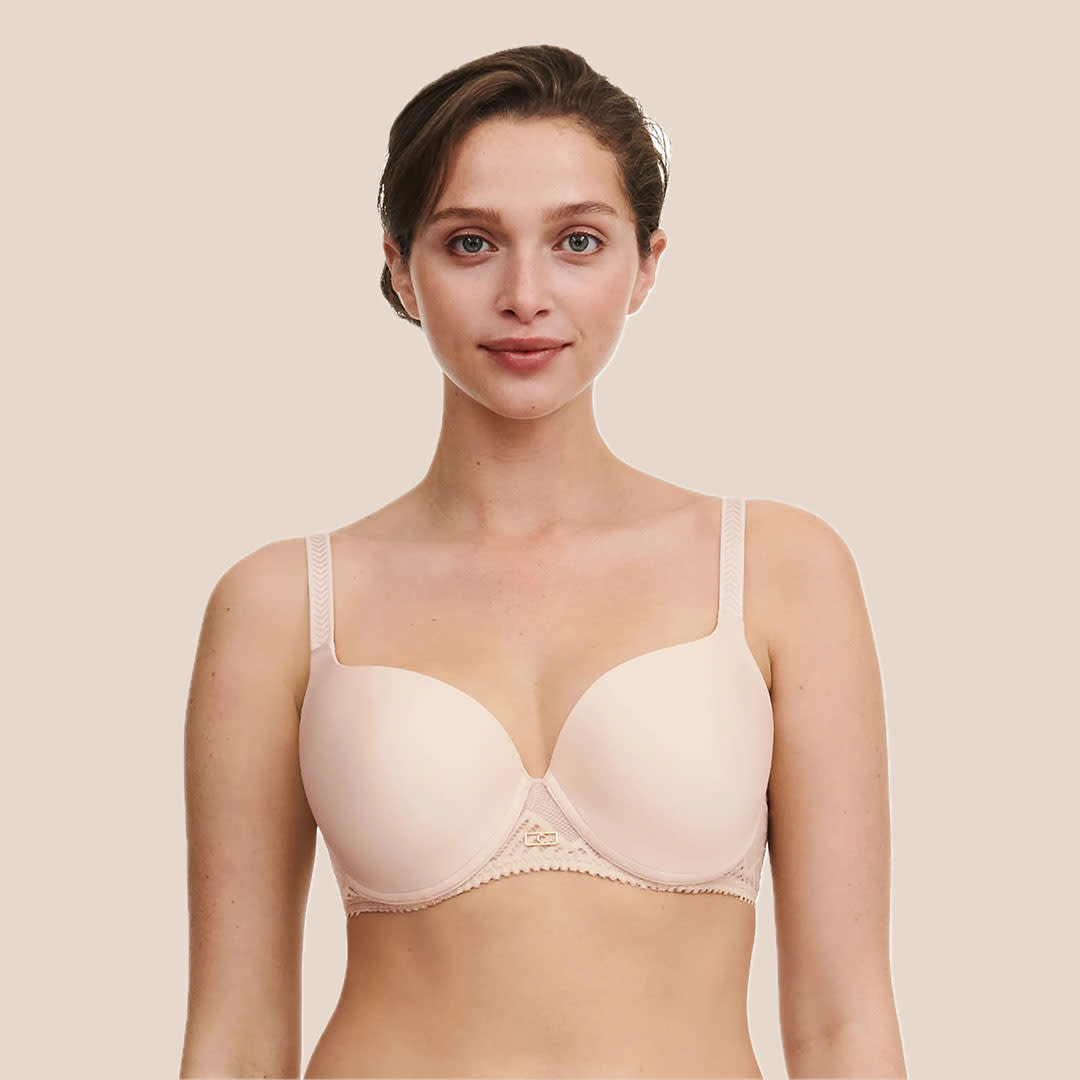 Floral lace with chevron detailing, the Origins Covering T-shirt Bra offers full support with a flattering neckline, adjustable straps, a C-branded jewel, and a tall chimney back lined in elastic tulle for all-day comfort.
