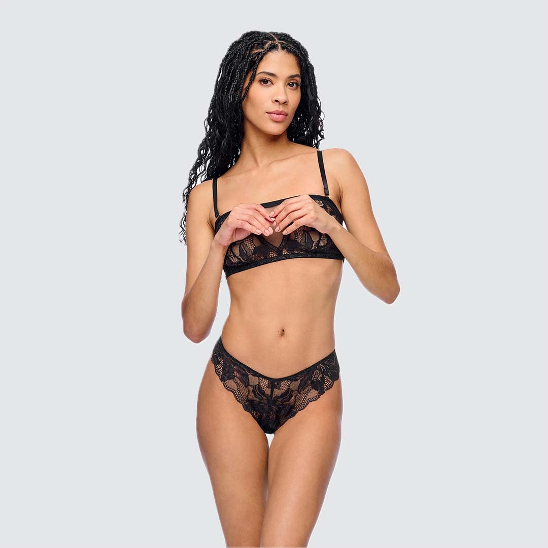 The Paradiso Thong is a mid-rise thong crafted from semi-sheer tricolour lace with a delicate scalloped edge. Designed for a flattering fit with minimal rear coverage and a soft, cotton-lined gusset for comfort. Hand wash only; do not tumble dry.