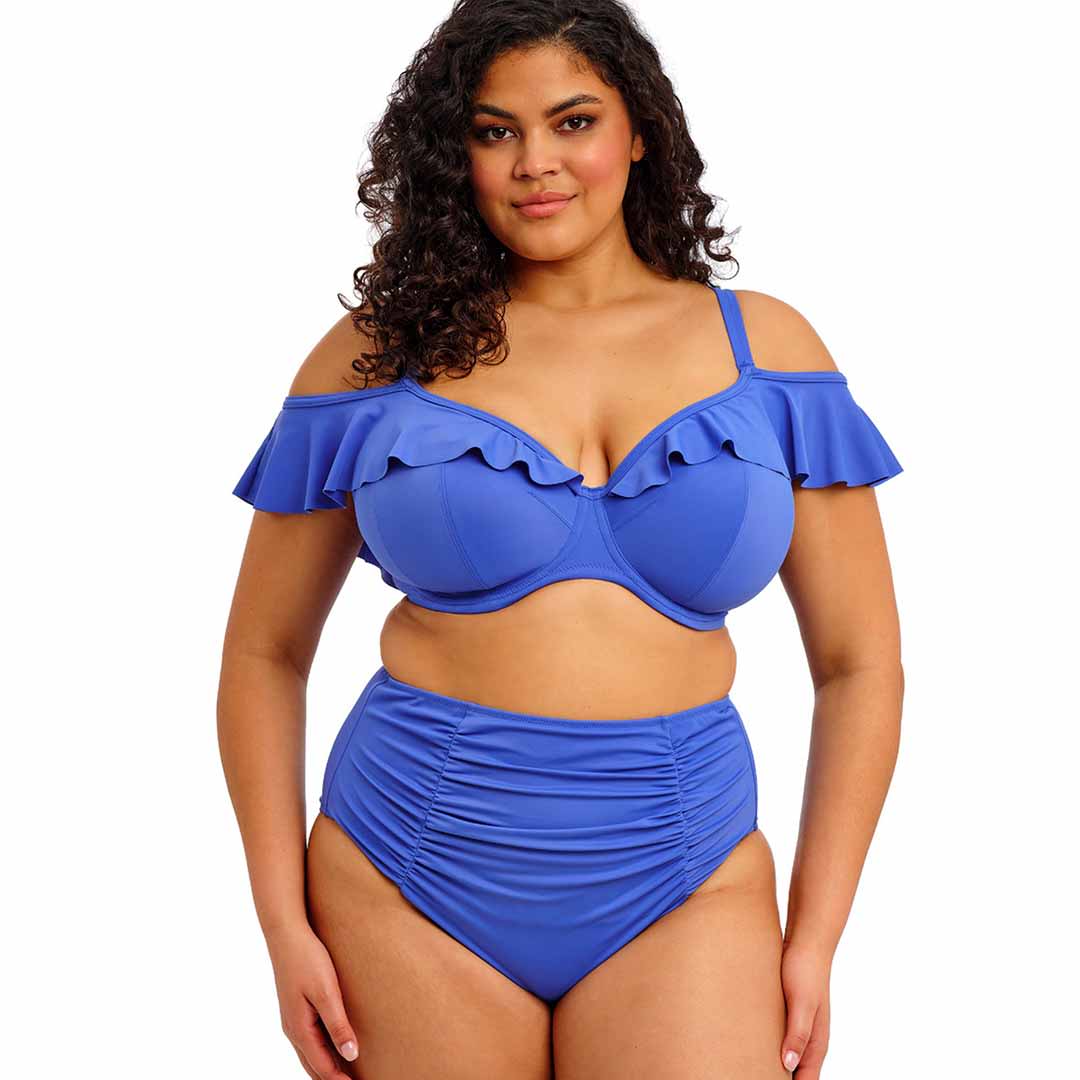The Plain Sailing Underwire Plunge Bikini Top with narrow straps and a playful ruffle that can be worn on or off the shoulders, fully lined with light yet supportive fabric to give the look of a bikini with the fit of an Elomi lingerie bra, and cut from lightweight LYCRA® XTRA LIFE™ for lasting shape and comfort.