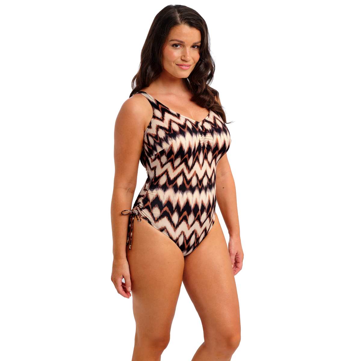 Sabana blends warm browns, blacks, and soft cream tones, finished with gold metallic accents for a standout look. It features a flattering V-neckline with concealed underwire for support, adjustable tie sides that create a tummy-flattering ruched effect, and offer varied leg coverage. A lower scoop back and built-up straps ensure an easy, comfortable fit. Fully lined, with metallic bead details that won’t heat up in the sun.