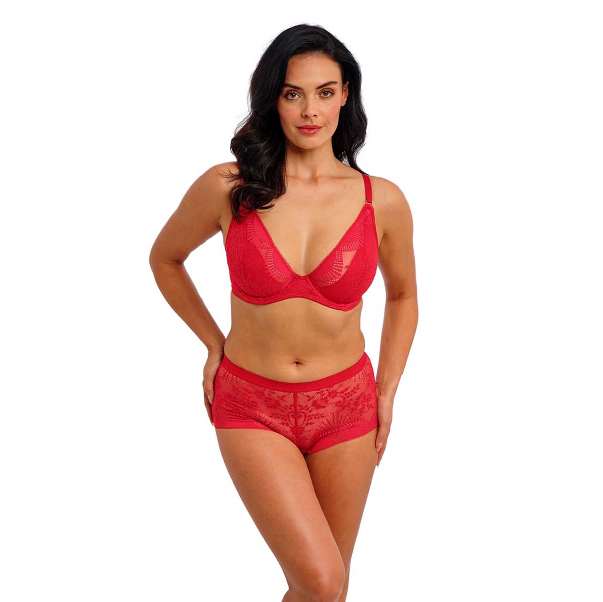 The Sensu Lace Underwire Plunge Bra introduces a new silhouette with a high apex and low center front, perfect for a flattering neckline. It features stretch lace darted outer cups with a sheer fine elastic along the neckline to maintain fit. The inner 3/4 cup is constructed with super soft spacer fabric for modesty, comfort, and gentle shaping. Stretch lace wings, lined with stretch mesh in larger sizes, offer a feminine appearance while providing strength and support. Completing the contemporary design, a silver-colored rectangular trim adorns the front apex. This bra boasts soft-touch elastics and strapping for ultimate comfort, fully adjustable, convertible straps for over-the-shoulder or crossed-back wear, and a soft-touch hook & eye adjustment.