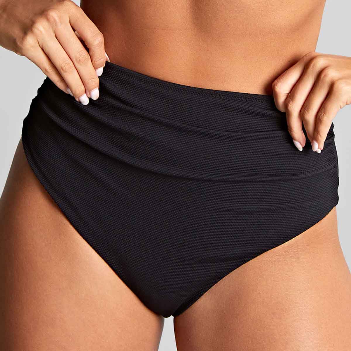 High waist style. Gathered detail.