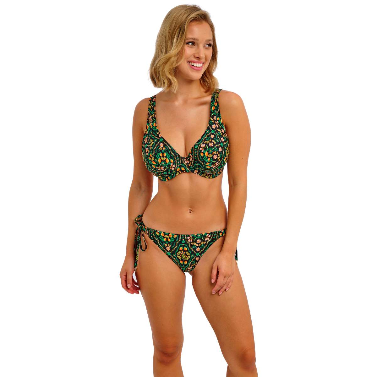 Soak up the sun and make the most of your summer days in Sunset In Seville, Freya’s vibrant new print for the season. Inspired by sun-kissed citrus groves and traditional Andalusian tiles, this collection blends jade, zesty tones, and golden hues on a bold black background, with select styles featuring a luxurious gold leaf trim. Designed for a flattering, adjustable fit, this bikini brief sits low on the hips, features narrow adjustable sides, offers medium bottom coverage, and is finished with elegant gold leaf trim details on the tie ends.