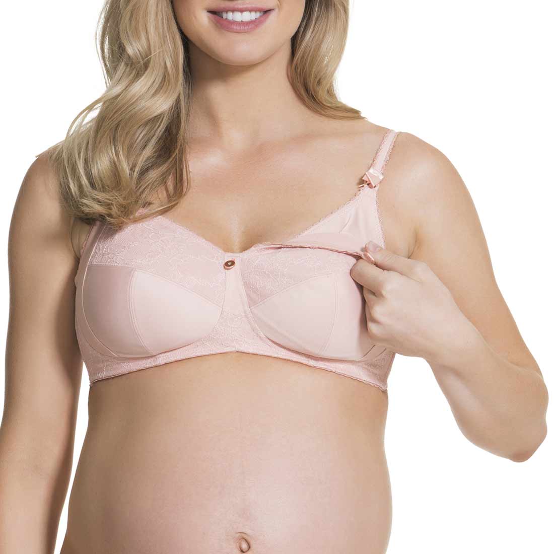 This full cup wireless maternity and nursing bra is designed with femininity & comfort in mind! Featuring a cotton A-frame for discreet breastfeeding and fully adjustable straps for function, you’ll love this perfect bra. The beautiful smooth lace detailing and centre diamanté rose gold pendant tops it off.
